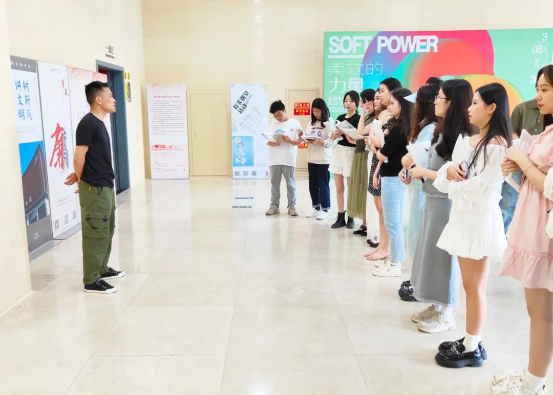 王峰向来访师生介绍了岳阳市美术馆的历史发展、场馆特色、展览活动及学术成果,并特别讲解了本月正在展出的“‘柔软的力量’、‘在水一方’岳阳市美术馆2023女艺术家、书法家提名双展”的展品及艺术家情况。